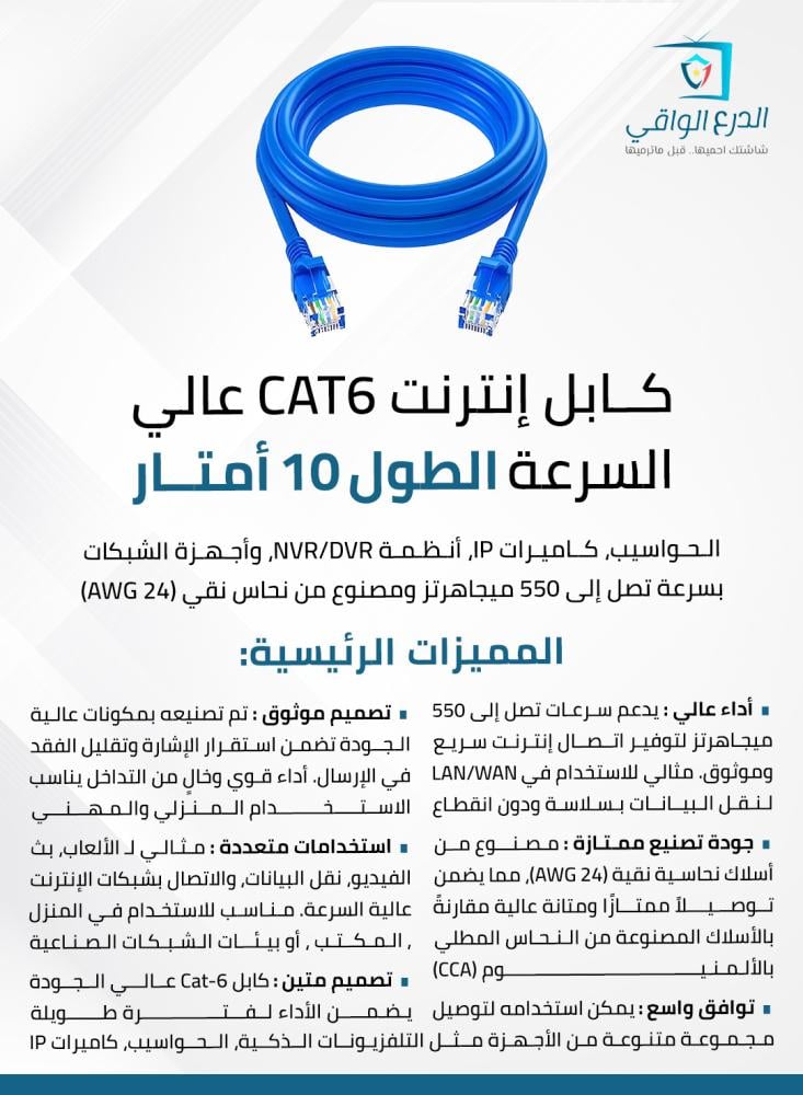 - كابل Cat-6 عالي الجودة يضمن الأداء لفترة طويلة.